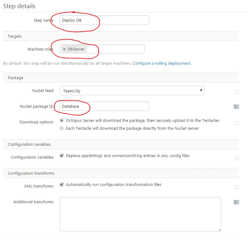 Lastly, we’ll enter the details of our step name and package details (in this example, I’m pulling the package from a TeamCity feed).