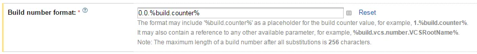 We can set this up under the General Settings tab of our build config. Parameters in TeamCity are referenced by wrapping them in % marks.