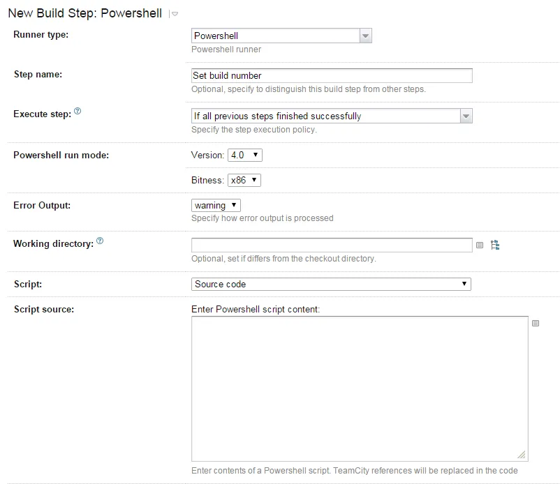 TeamCity includes PowerShell as part of its collection of build runners. We can use this to build out our build number to match the rules above.