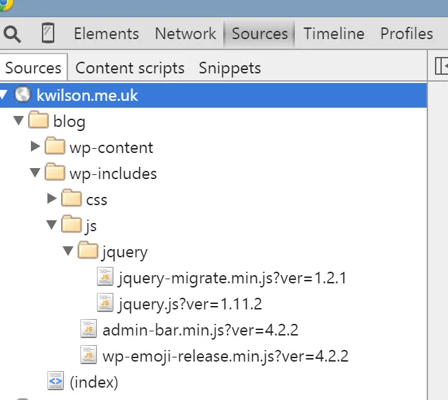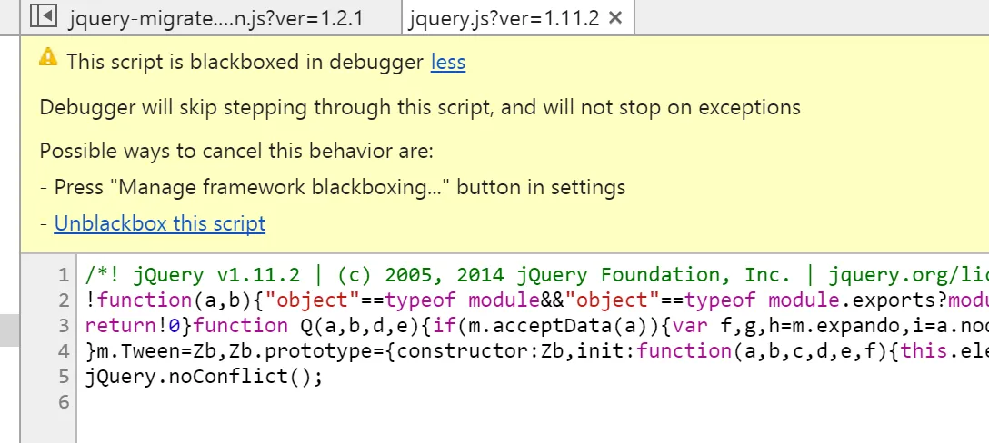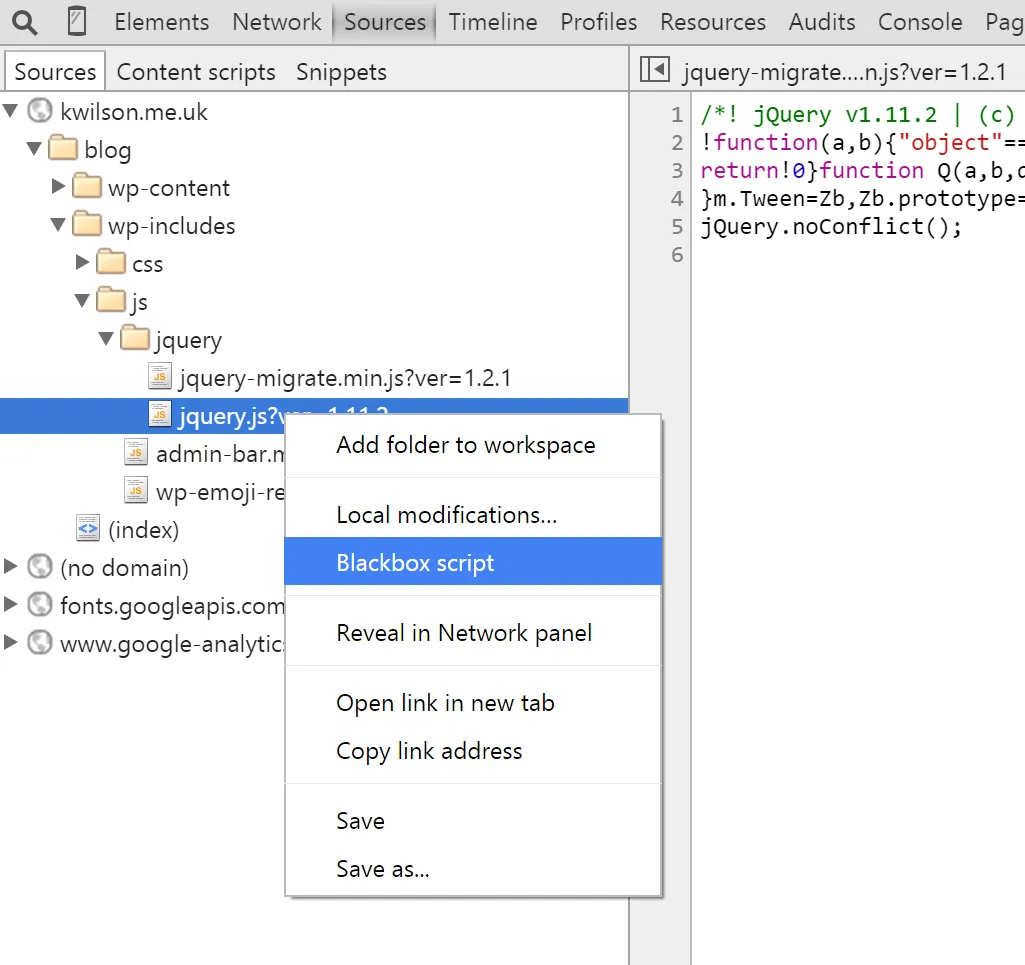 There are a couple of ways to blackbox a script – manually through DevTools settings, or through context menus on a script. Let’s have a look at blackboxing JQuery on a simple site.