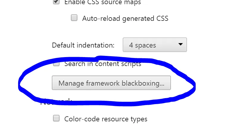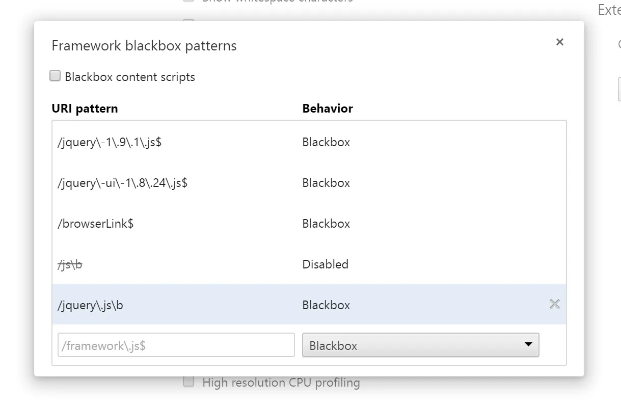You can now use this menu to edit the blackboxed script matchings or remove anything you don’t want to hide any more and keep your debugging to your own code.